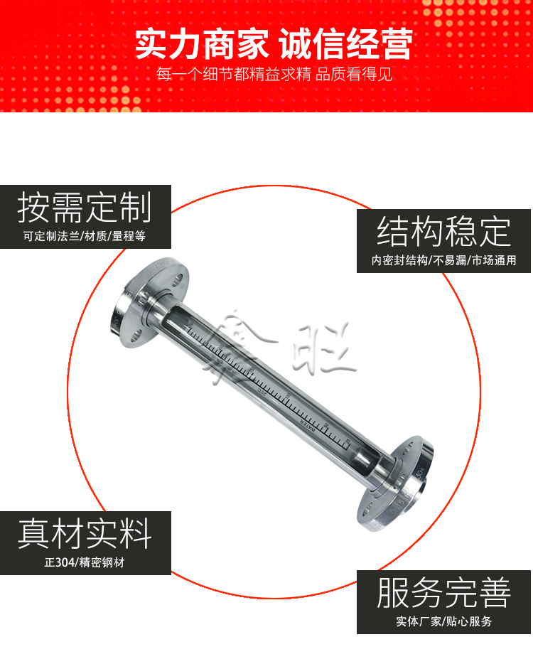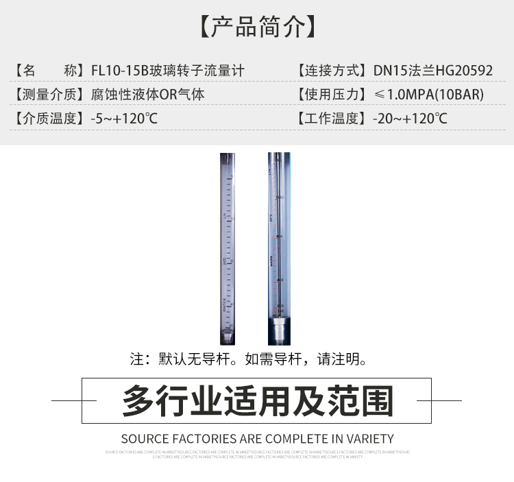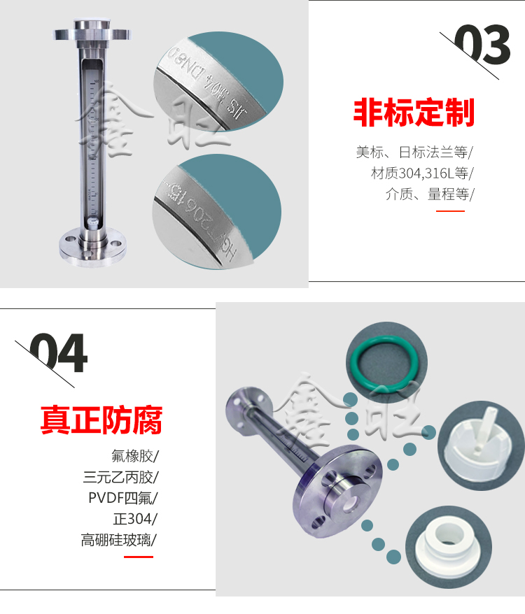 G/R/F10、20、30型玻璃转子流量计的连接有管螺纹(G10、20、30型)、软管(R10、20、30型);法兰(F10、20、30型)三种方式。其耐压和耐温均高于原有相同通径的LZB/LZJ系列玻璃转子流量 计产品;分普通型(测量一般无腐蚀流体)和耐腐型(测 量的腐蚀性流体)两种。产品体积小、结构轻巧,外形 美观,维修方便、安全可靠,安装简单。F10、20、30型 法兰可转动,与现场管道法兰孔吻合。