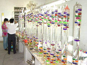 本产品是由圆筒形玻璃容器、带温度牌的彩球和惰性液体组成,没有任何环境污染,十分环保。彩球中的液体为彩色无毒液体,其金属小牌的材料为镀金合金,颜色亮丽,非常醒目。其工作原理是:利用液体的浮力、张力对温度的敏感性、不同温度下液体比重的差异而设计。中空的玻璃筒内装的是对温度敏感的液体,而彩球为不敏感体,当温度对玻璃筒敏感液体产生热力作用的时候,彩球因基本不受热力作用而升降,其中上浮最下面的小球下端的金属牌上面的读数就是当前周围环境的温度。