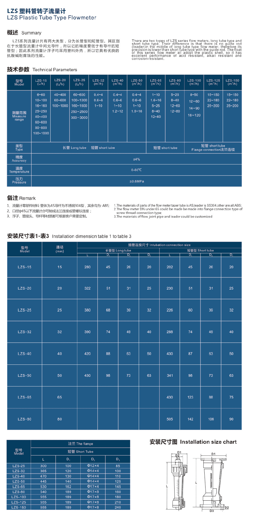 3. LZS- 系列塑管流量计结构图和尺寸