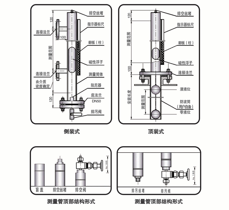 磁浮子液位计有多种安装形式满足用户需求,主要安装形式包括:侧装式、顶装式等。