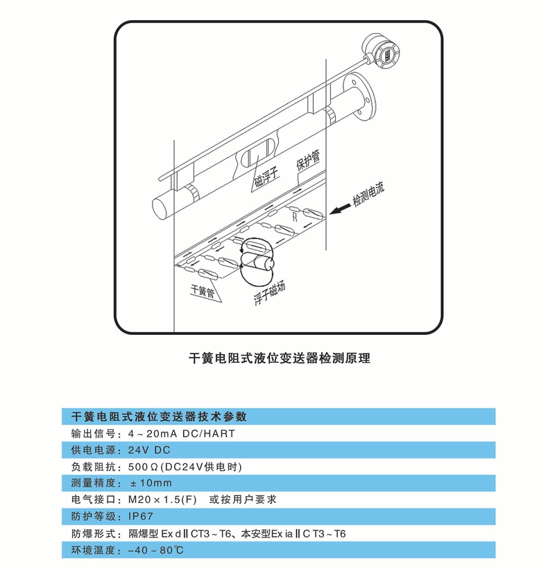 远传单元捆绑于测量筒体外侧,当储罐内液位发生变化时,会使带有yong久磁钢的浮子跟随液位移动。浮子移动使对应液位值的干簧管受到浮子磁场的作用闭合,阻值及电流发生变化,通过模电转换电路输出4~20mA信号,从而实现液位信号远传的目的。在防爆场合应用时,干簧电阻式液位变送器选用隔爆型壳体。