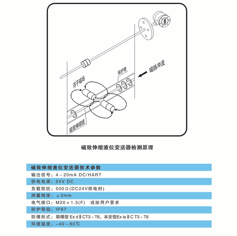 远传单元捆绑于测量筒体外侧,远传单元发射电流脉冲沿测量管内的磁致伸缩线形成环形磁场。当储罐内液位发生变化时,会使带有yong久磁钢的浮子跟随液位移动。浮子的磁场使磁致伸缩线沿轴向磁化。两磁场叠加处产生扭转脉冲,远传单元检测该脉冲的传送时间经处理器处理后通过模电转换电路输出4~20mA信号,从而实现液位信号远传的目的。在防爆场合应用时,磁致伸缩液位选用隔爆型壳体。