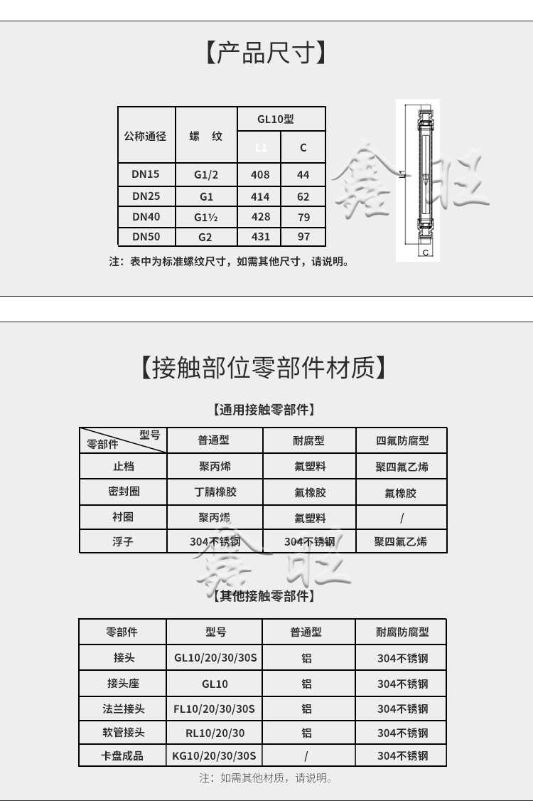GL/RL/FL10、20、30型玻璃转子流量计的连接有管螺纹(GL10、20、30型)、软管(RL10、20、30型);法兰(FL10、20、30型)三种方式。其耐压和耐温均高于原有相同通径的LZB/LZJ系列玻璃转子流量 计产品;分普通型(测量一般无腐蚀流体)和耐腐型(测 量的腐蚀性流体)两种。产品体积小、结构轻巧,外形 美观,维修方便、安全可靠,安装简单。FL10、20、30型 法兰可转动,与现场管道法兰孔吻合。