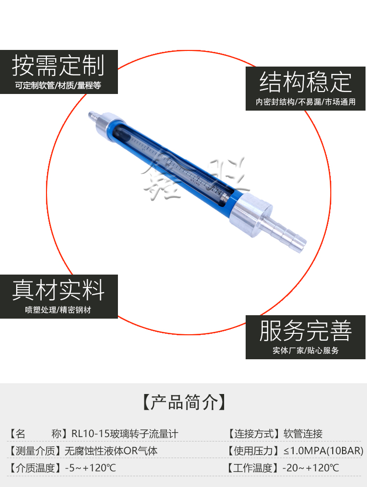 GL/RL/FL10、20、30型玻璃转子流量计可替代引进成套设备上的玻转仪表,广泛的应用于化工、轻工、制药、食品、造纸、环保和计量测量、科研等部门,测量单项非脉动流体(气体或液体)的流量。
