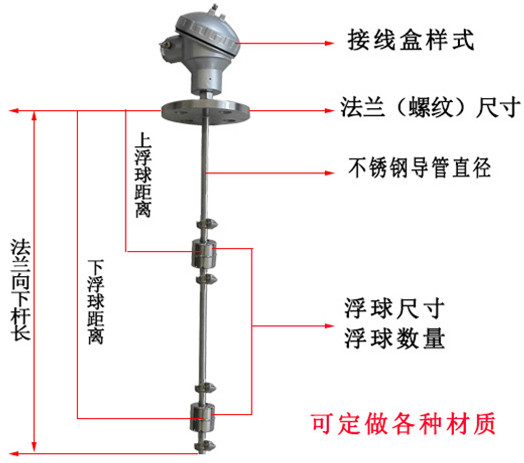 簧片开关与每一个预定测出或报警的液位是固定的,导杆又起着浮子导向的作用,浮子随导杆上下移动,簧片开关处于磁场中时接通,处于磁场外时呈断开状态。