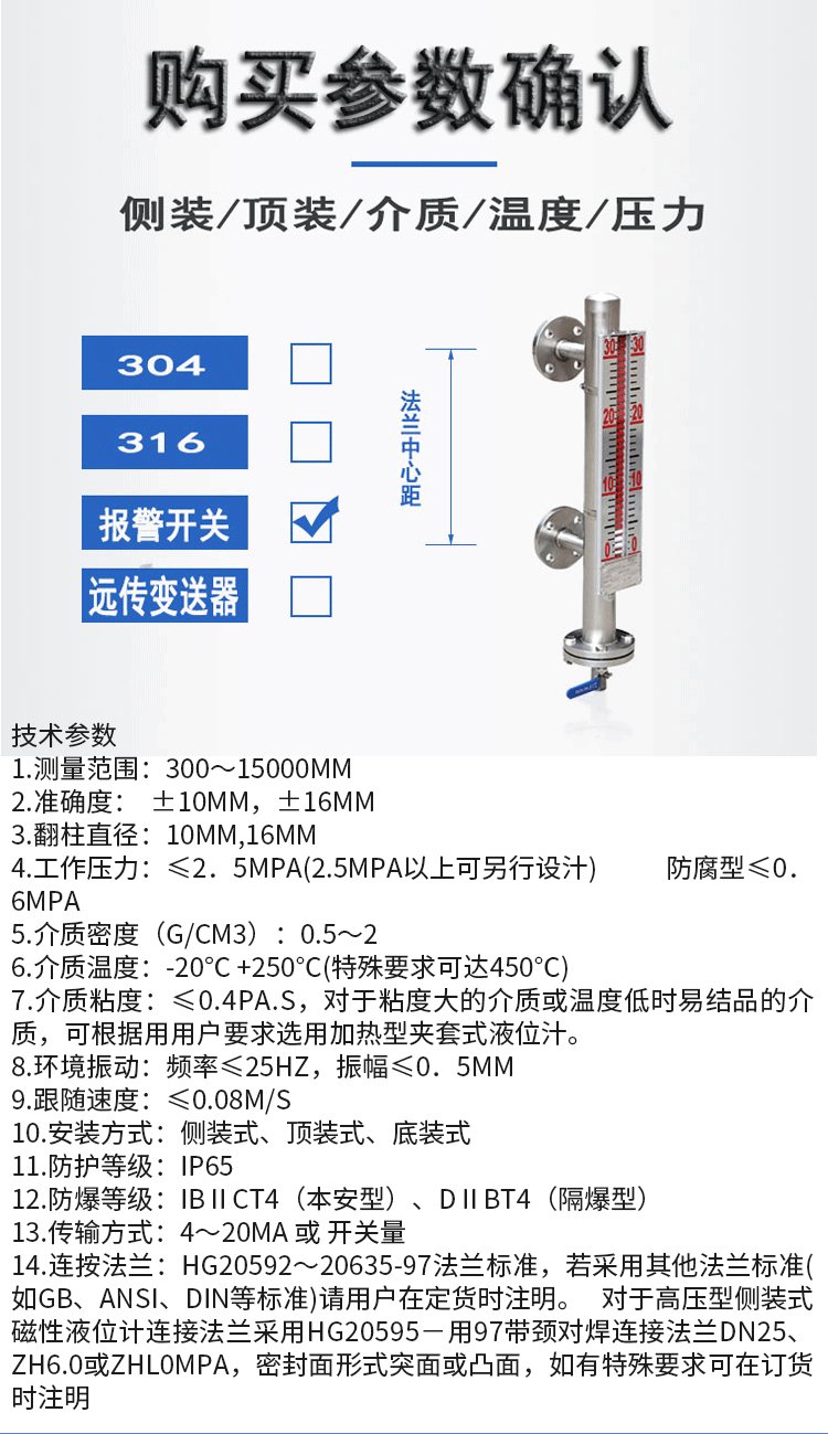 5.磁翻板液位计最显著的特点是液体介质与指示器完全隔离,所以在任何情况下都非常安全,可靠,耐用,而且各种型号的磁翻板液位计配上液位报警、控制开关,可实现液位或界位的上、下限越位报警,控制或连锁。